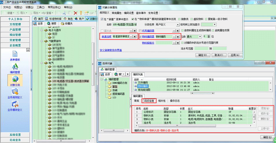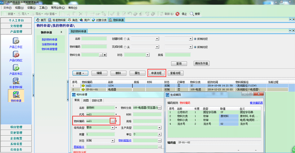 傲派的標準件種類繁多、數量龐大,三品軟件細致劃分不同種類的標準件并且綁定不同的編碼規則以及審核流程;當需要新增的標準件時,三品軟件通過【物料申請】模塊進行物料申請,并根據此類物料所綁定編碼器的編碼規則,自動編制具有唯一性的物料編碼,創建新物料完成之后,可便捷的啟動新物料所需的審核流程,然后自動歸檔存庫。