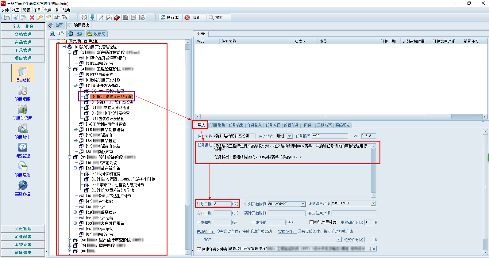 貼合國顯科技APQP、TS16949開發管理要求在PLM系統中規范建立各類項目開發管理流程模板(階段任務、子任務、任務描述、任務項目角色、初始工期、任務輸出、任務輸入、任務相關流程、各任務前后置關系、啟動條件和完成條件、里程碑設置等等),規范了項目開發管理流程,同時也滿足國內外客戶的審廠標準。