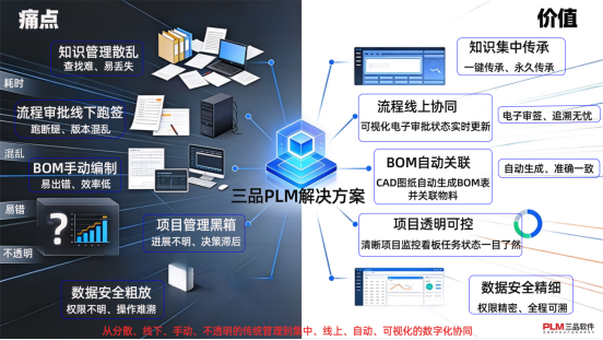 與傳統以文件夾共享、紙質審批為主的管理模式相比,三品PLM系統體現出以下差異化優勢: