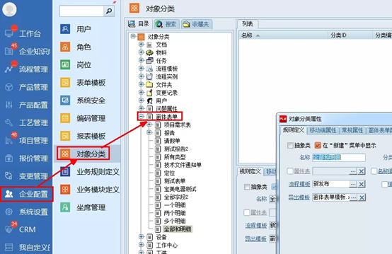 選擇“企業(yè)配置”-->“對象分類”,在右邊對象分類樹的“窗體表單”節(jié)點(diǎn)下,找到需要設(shè)置的窗體表單名,點(diǎn)擊鼠標(biāo)右鍵,彈出右鍵菜單,點(diǎn)擊“屬性”。