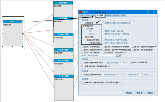 需要用戶手動選擇容易造成選擇錯誤,也會增加用戶的學習成本,針對這些情況,三品PLM在流程模版建立時,可對流程的執行策略進行自動轉移設置。