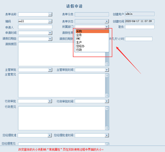 若請假表單如下圖,在用戶填寫好請假申請單后,發起申請流程,流程轉移條件可根據用戶所屬部門進行條件轉移。