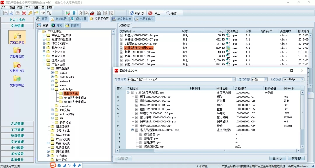為了更好解決BOM清單的準確性、快速導出等問題,PDM系統支持從Solid Edge圖紙信息中提取屬性信息和裝配信息,自動生成產品結構樹,匯總BOM信息等。