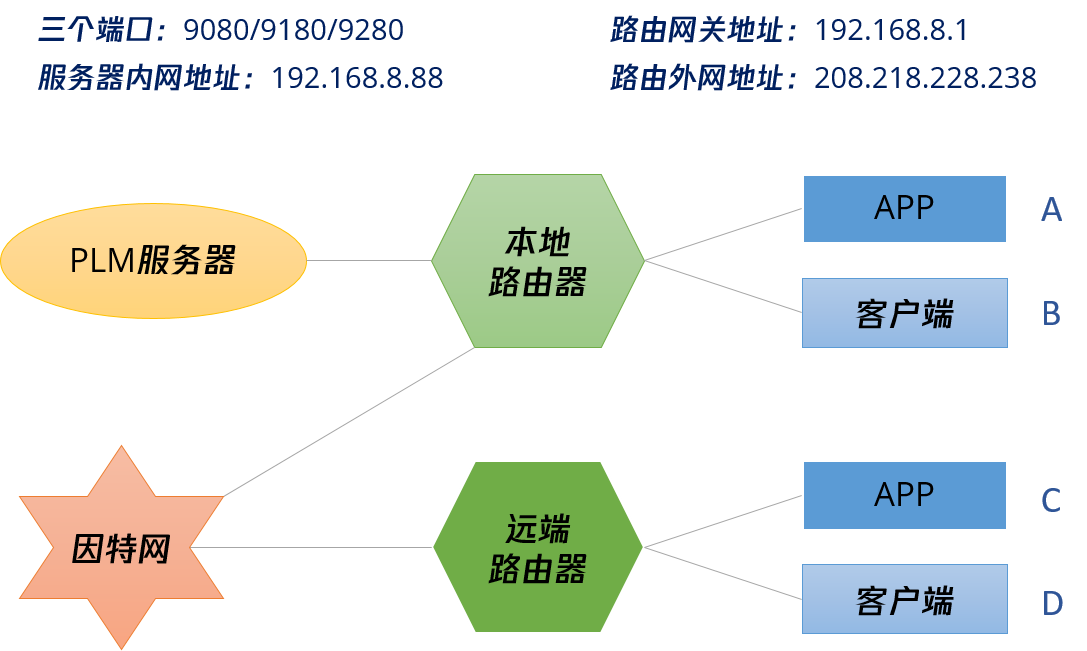 沒有在本地路由器做任何映射之前,A和B可以通過192.168.8.88和對應的三個端口9080/9180/9280 訪問PLM服務器。但是C和D就不能了。因為C和D沒有直接連接在本地路由下,是不能直接通過192.168.8.88這個地址進行連接的。如果要C和D也能夠訪問PLM服務器,就必須要在本地路由器中進行端口設置了。