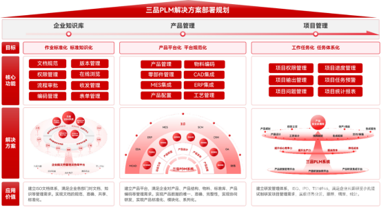 三品PLM解決方案以產品為核心,構建貫穿“概念->設計->工藝->制造->服務->報廢”的完整數字主線,為企業提供一體化管理平臺: