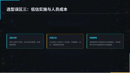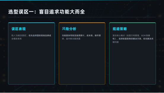 PLM選型是一項系統工程,絕非簡單的軟件采購。珠三角中小企業在選型過程中,尤其需要警惕以下五大常見誤區,以免投入巨大卻收效甚微。