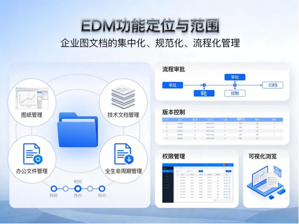? EDM:定位為研發(fā)文檔標準化管理工具,核心使命是解決企業(yè)圖文檔分散、版本混亂、審批低效的痛點,是企業(yè)知識沉淀與文檔協(xié)同的 “基礎底座”,不涉及產(chǎn)品核心數(shù)據(jù)的結(jié)構(gòu)化管控。