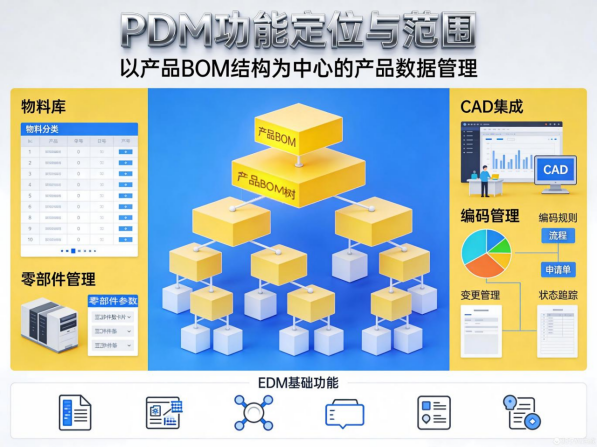 ? PDM:在 EDM 文檔管理功能基礎上,新增結(jié)構(gòu)化數(shù)據(jù)管理核心功能,包括 BOM 構(gòu)建與管理、物料編碼管理、零部件重用、CAD 集成、變更管理(針對物料與 BOM)、與 ERP/MES 系統(tǒng)集成等,聚焦產(chǎn)品數(shù)據(jù)的準確性與一致性。