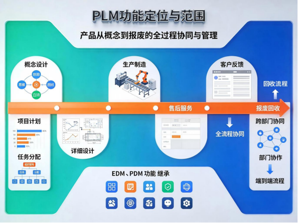 ? PLM:定位為全生命周期協(xié)同管理平臺,覆蓋產(chǎn)品從概念到報廢的完整流程,強調(diào)跨部門、全流程的協(xié)同與項目維度的管控,是整合文檔、數(shù)據(jù)、流程的 “一體化中樞”。