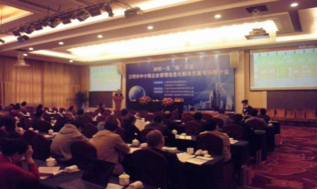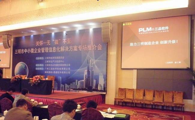 2012年3月30日,在福建三明市五星級賓館天元國際大酒店,三品軟件聯合三明市經濟貿易委員會、三明市生產力促進中心隆重召開了“三明市制造企業管理信息化解決方案專場推介會”。 會議目標旨在促進三明市制造企業創新升級,提高企業生產經營管理和數字化研發設計水平,促進信息化和工業化“兩化融合”,增強企業市場競爭力。會議受到三明市信息化主管部門的高度重視,市經貿委、生產力促進中心、機械協會姚慶煥等領導一行出席了本次會議,并在會議上作出了重要的發言,三明市60余家制造企業,近百人參加了本次會議。